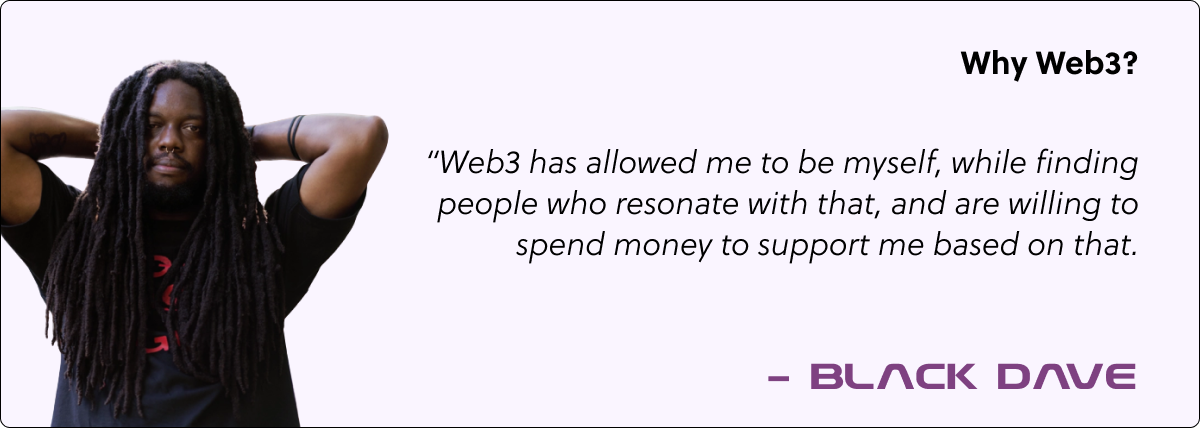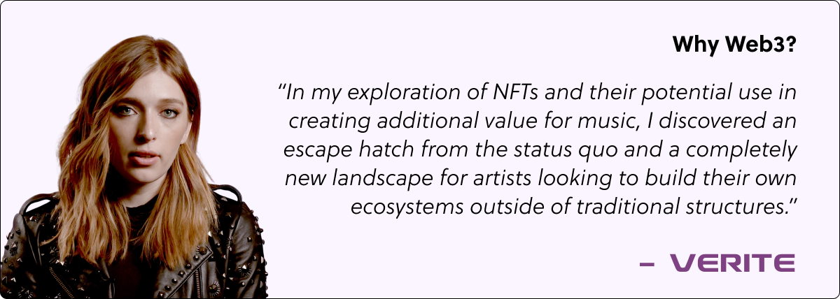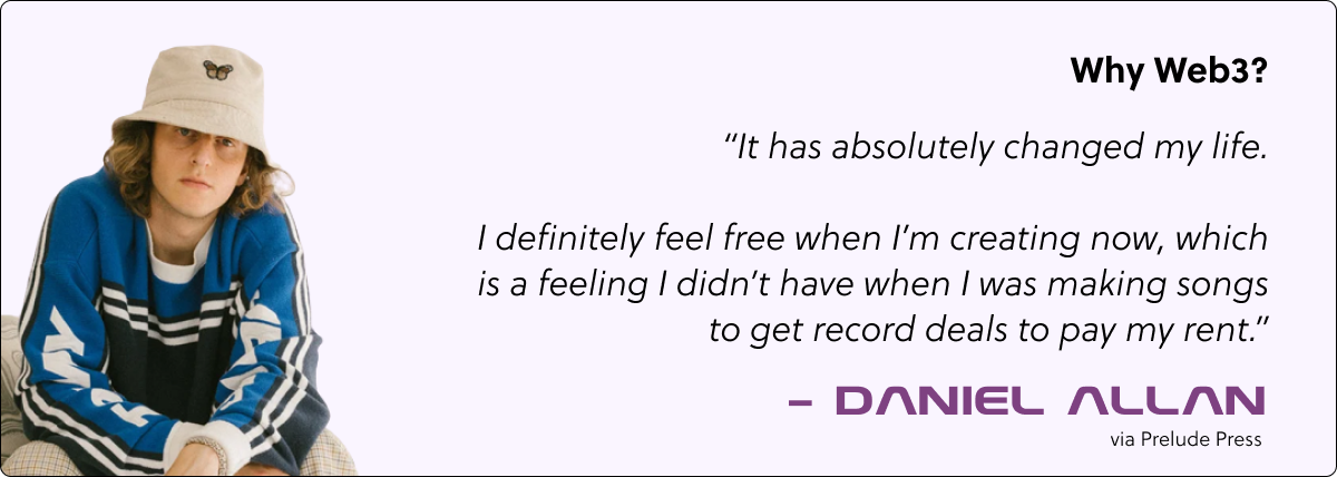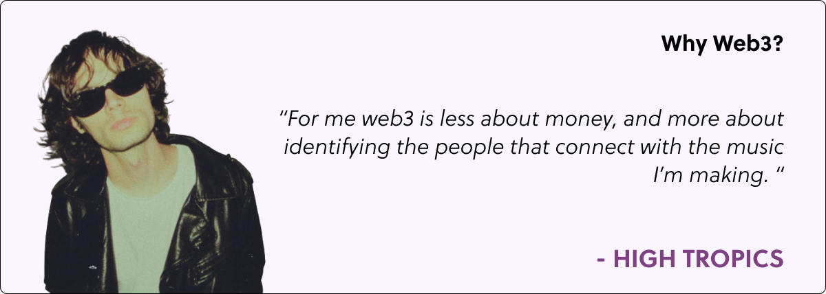 “My journey in web3 has pushed me further financially than it would have through traditional music models. Artists who are early in their journey, I'm just a couple of years in, really struggle to capture value from the fans that they have, since streams don't pay much and neither do shows. The constant battle of chasing going viral on social media is tiresome and in many ways can move you away from your original goal. Web3 has allowed me to be myself, while finding people who resonate with that, and are willing to spend money to support me based on that. I'm having a different battle with social media, finding ways to consistently be present, but at least through existing in the world of web3, I can do it by being myself. Traditional music often pushes us to not be ourselves in order to go viral or gain fans who may not directly resonate with us. I'm excited, and massively grateful to be doing well in web3.”