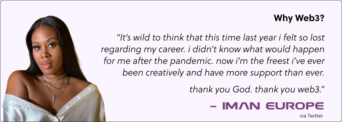 “It’s wild to think that this time last year i felt so lost regarding my career. i didn’t know what would happen for me after the pandemic. now i’m the freest i’ve ever been creatively and have more support than ever. thank you God. thank you web3.”